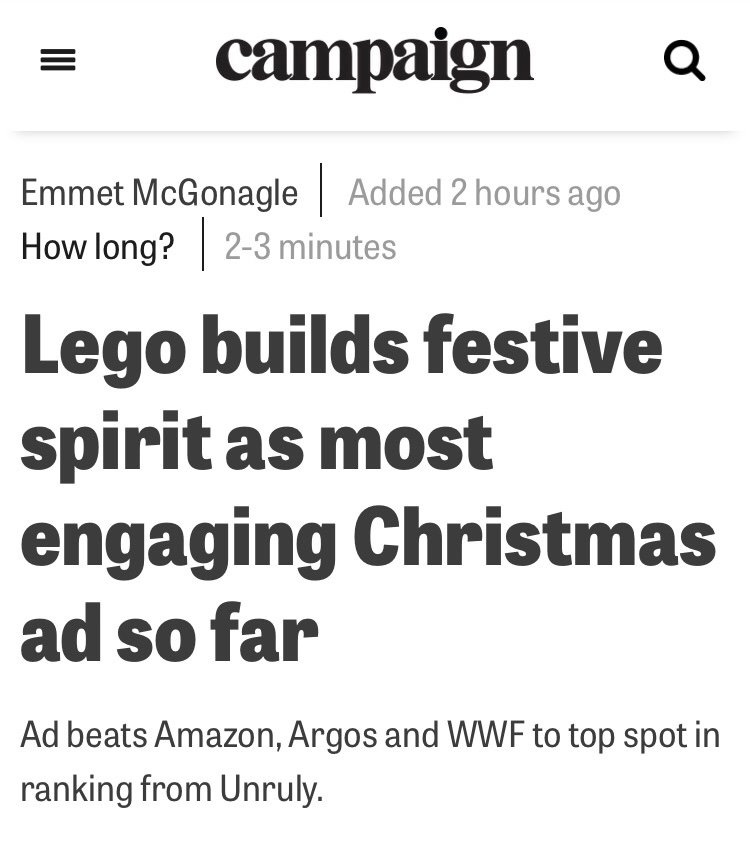 The LEGO Group’s biggest global brand campaign to date became the UK’s most engaging Christmas advert of 2020 – and one of the most effective ads of all time, according to research.